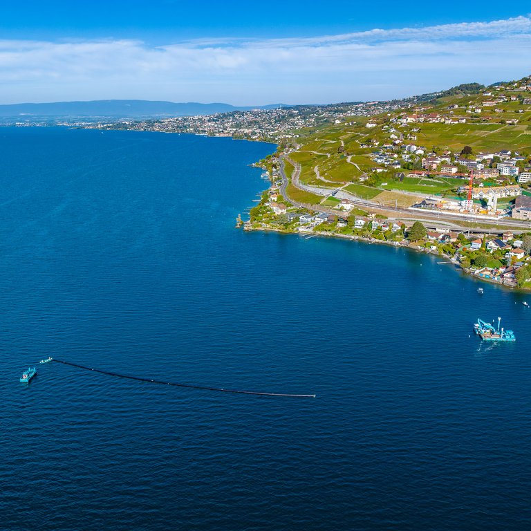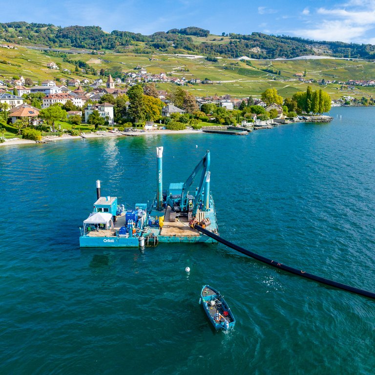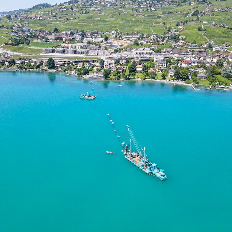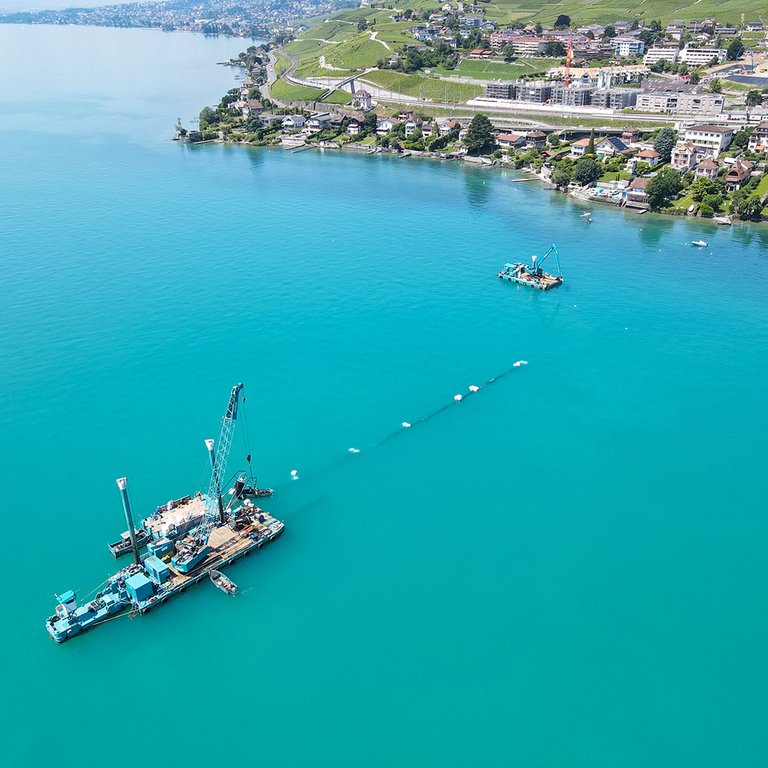 Dans le cadre de la construction du chauffage à distance de la commune de Bourg-en-Lavaux, la dernière conduite lacustre a été posée à 50 m de profondeur au large de Cully.