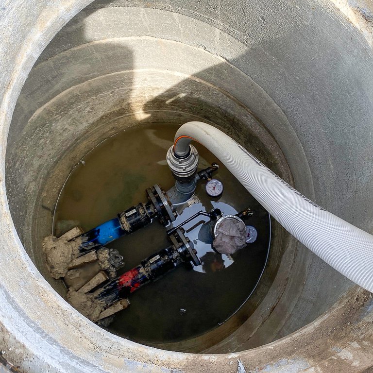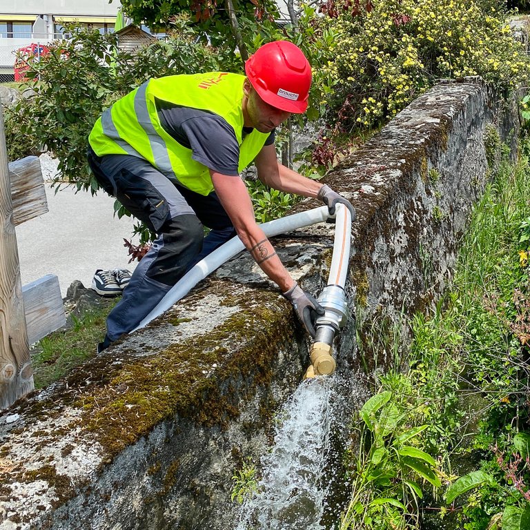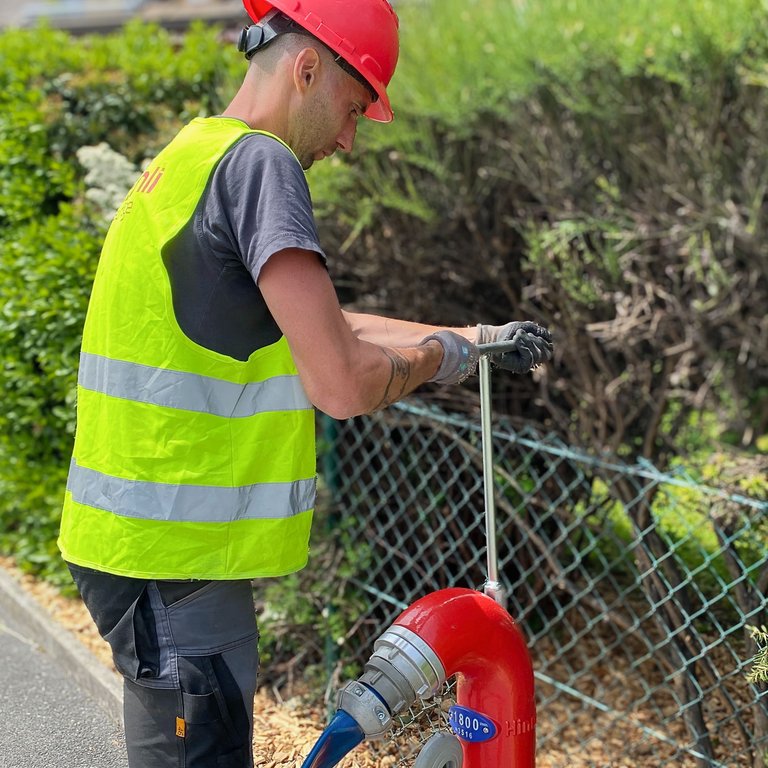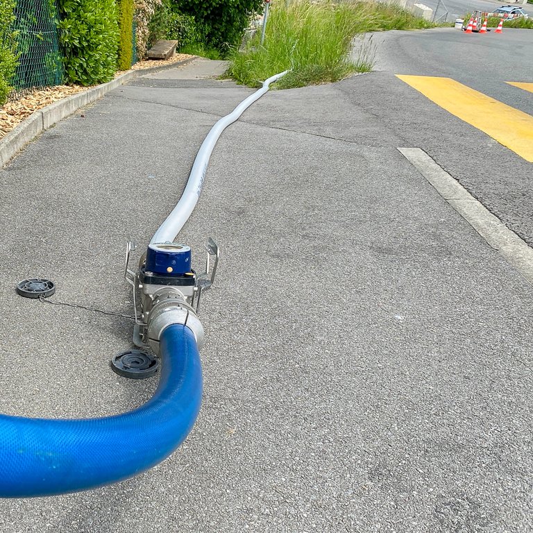 Une première phase de rinçage des conduites et de tests de pression a eu lieu en mai du côté du bâtiment de Champ-d'Or. Les équipes de Brauchli ont injecté de l'eau dans une partie du réseau de chauffage à distance depuis une borne hydrante. Introduite à haute pression, cette eau a poussé les résidus liés aux travaux jusqu'à un filtre, où ils ont été récupérés.