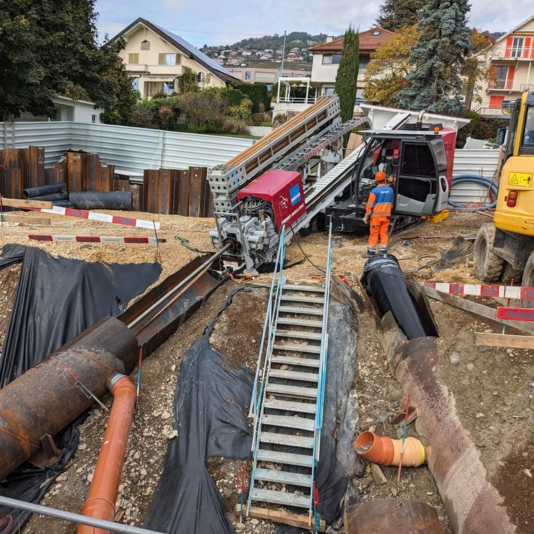 Les travaux ont débuté vers le bâtiment de Champs-d'Or. Notre équipe a assemblé les conduites et les a présoudées en vue de leur pose dans les prochaines semaines.