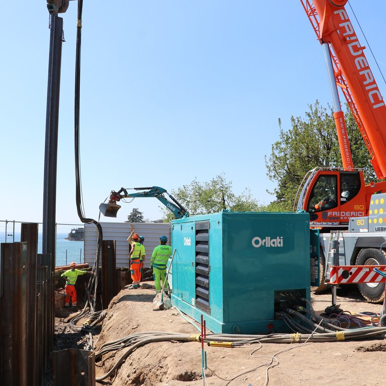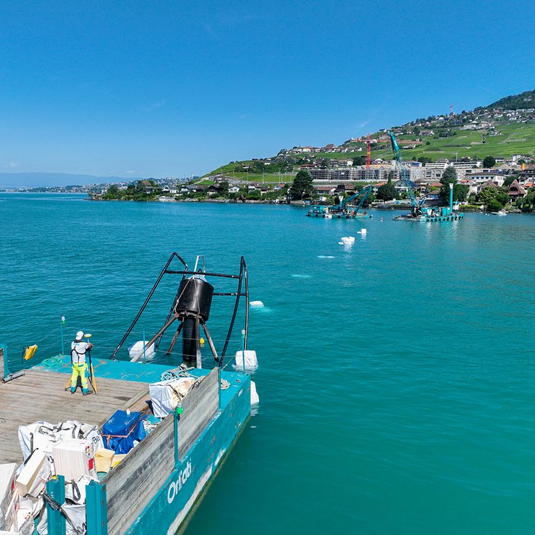 Cette étape-clé a nécessité un important dispositif de plateformes de travail, barges et bateaux, ainsi que l’intervention d’une équipe d’une quinzaine de personnes du groupe Orllati SA, dont deux équipes de scaphandriers expérimentés.