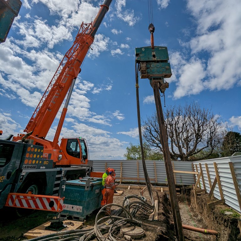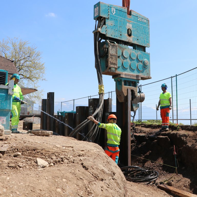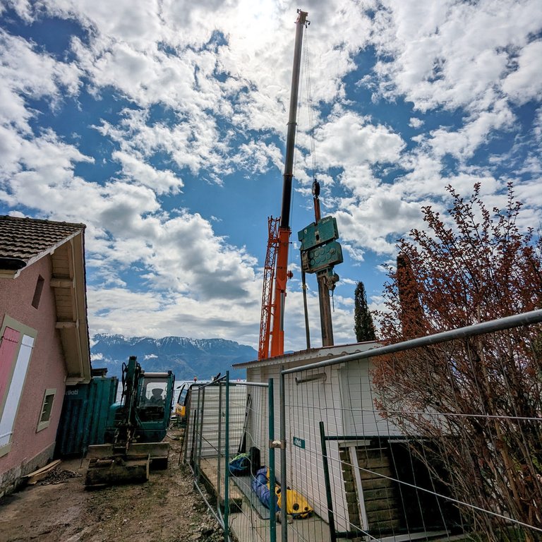 Depuis quelques jours, des palplanches sont enfoncées dans le sol du Bain des Hommes par vibrofonçage. Ces parois en acier de 15 m. de haut sont introduites une à une dans le terrain.