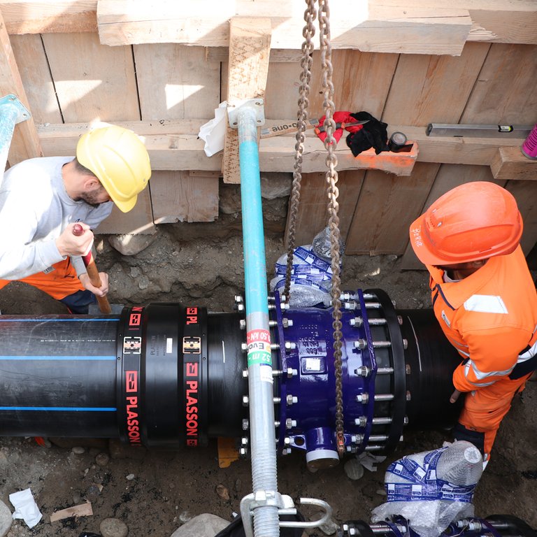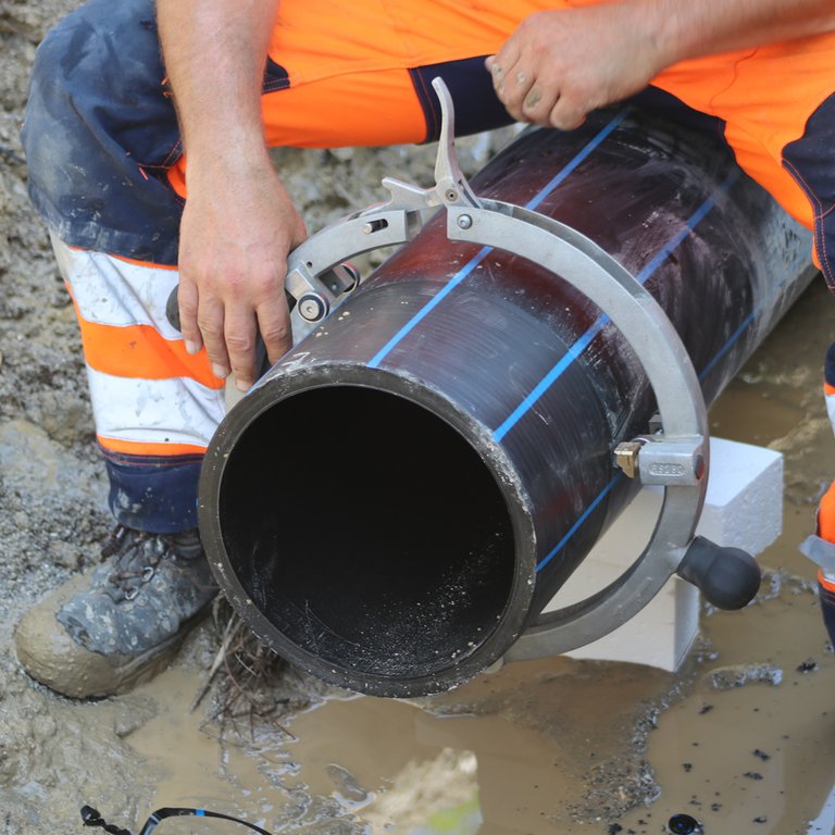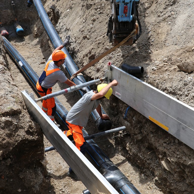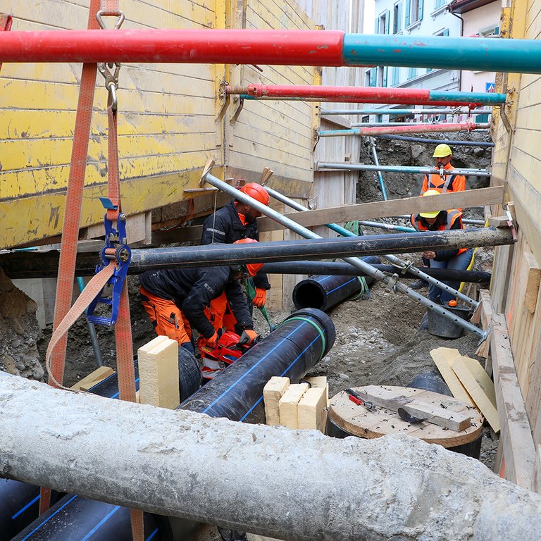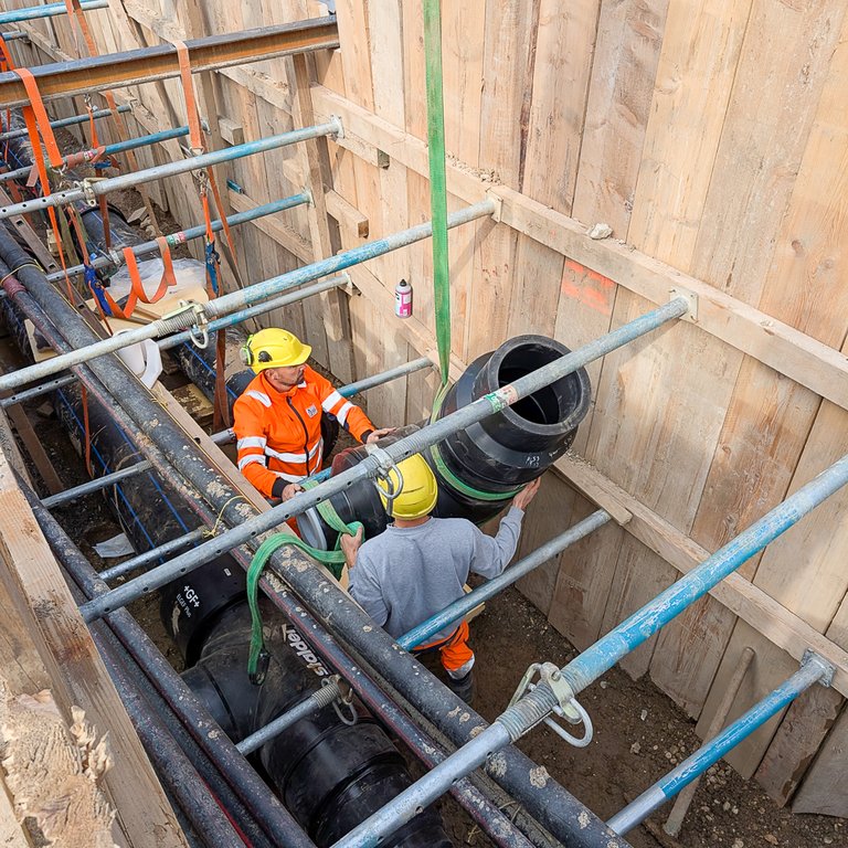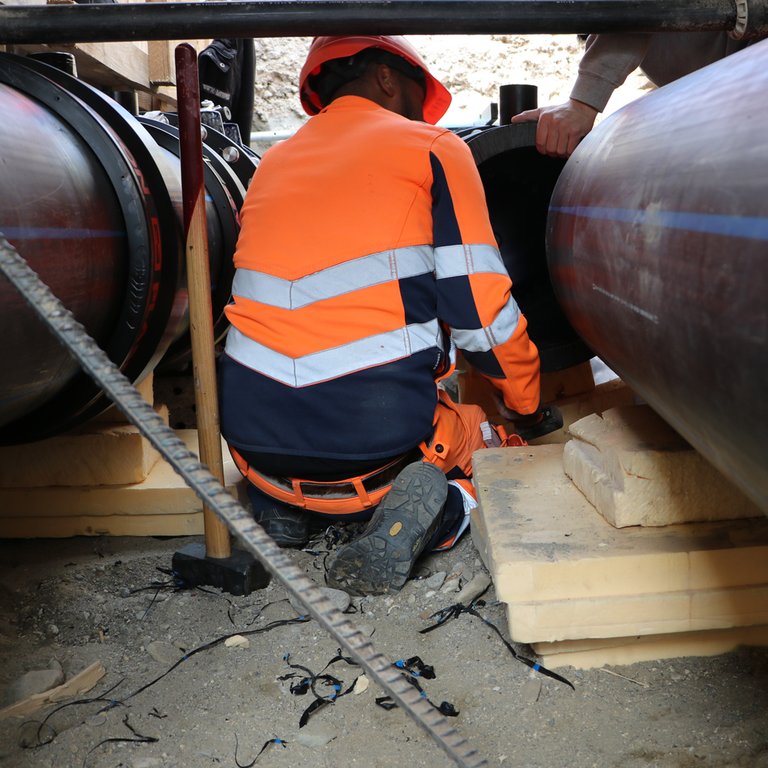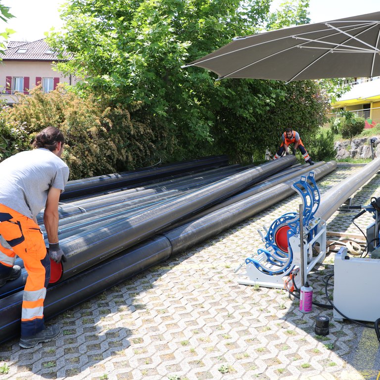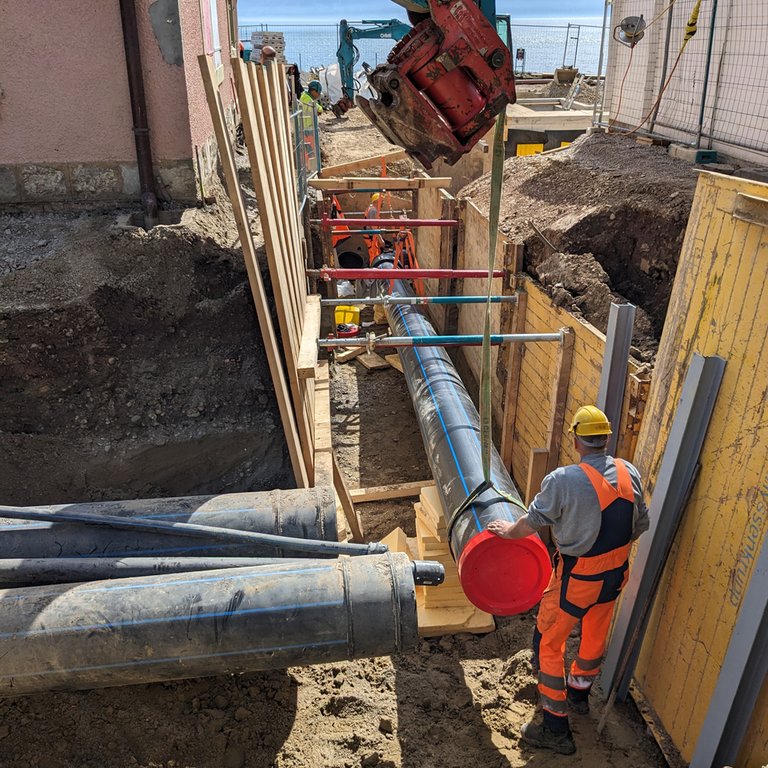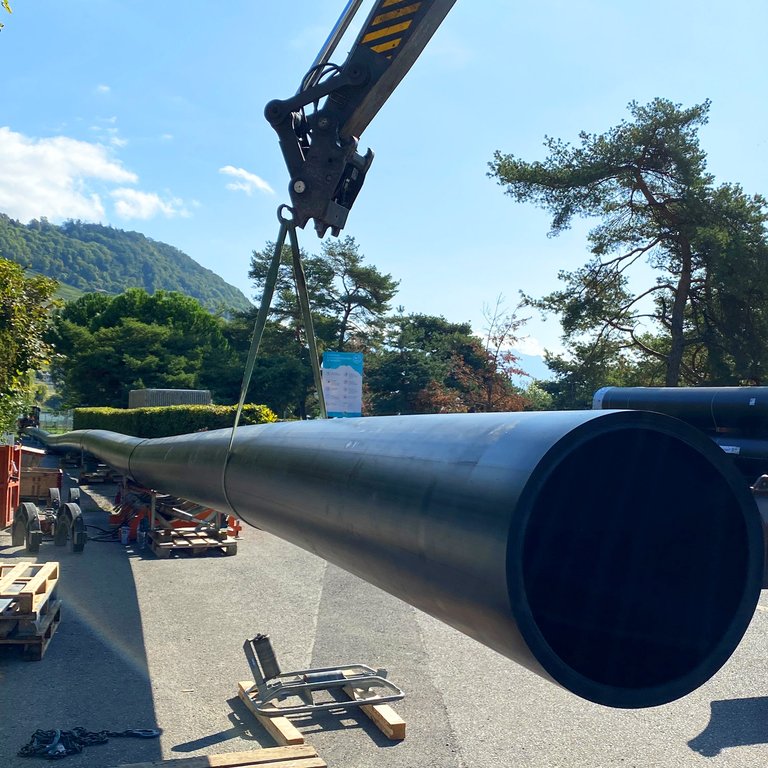Directement raccordées à la station de pompage, ces impressionnantes conduites de 50 cm de diamètre permettront d'assurer un débit d'eau optimal dans le réseau de chauffage à distance. Chacune d'elle mesure 10 m de long et pèse 650 kg, raison pour laquelle il est nécessaire de les déplacer à l'aide d'une pelle mécanique.