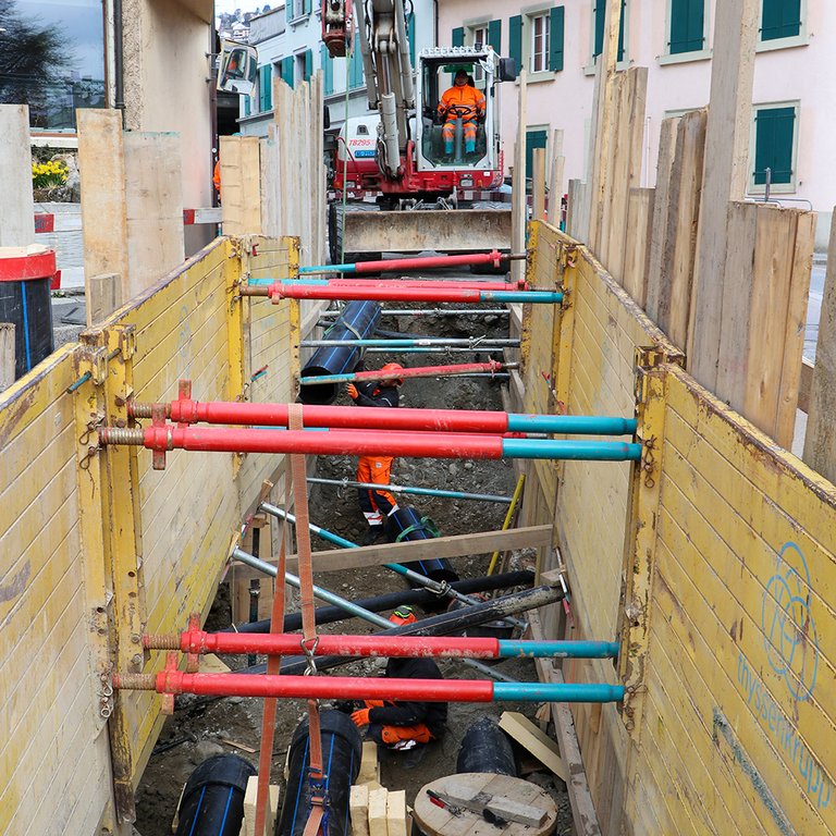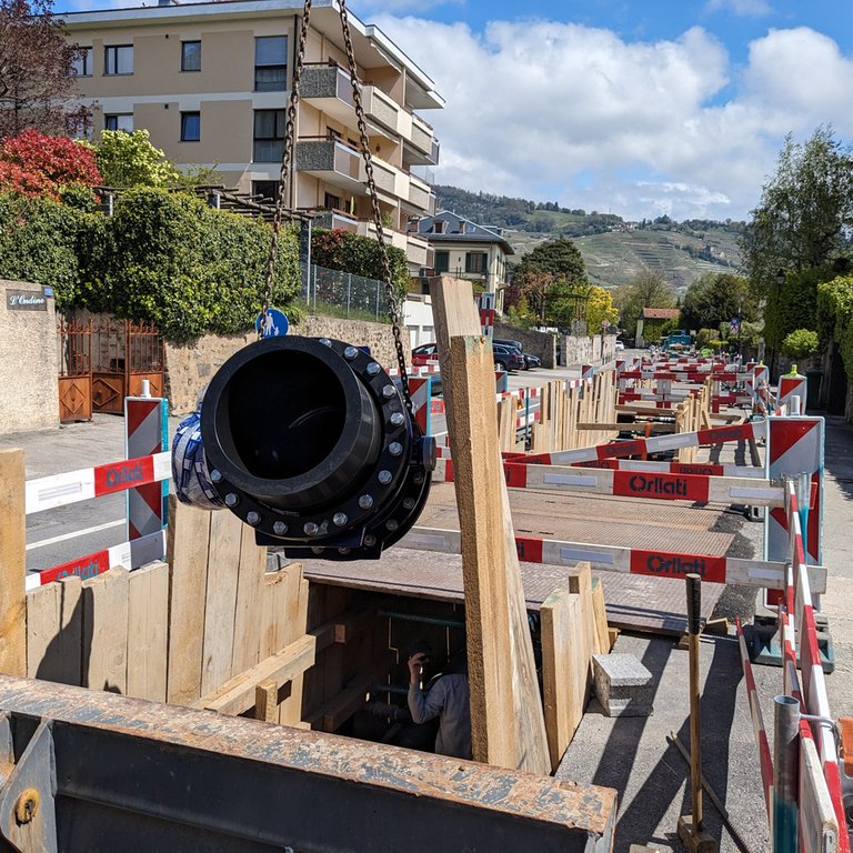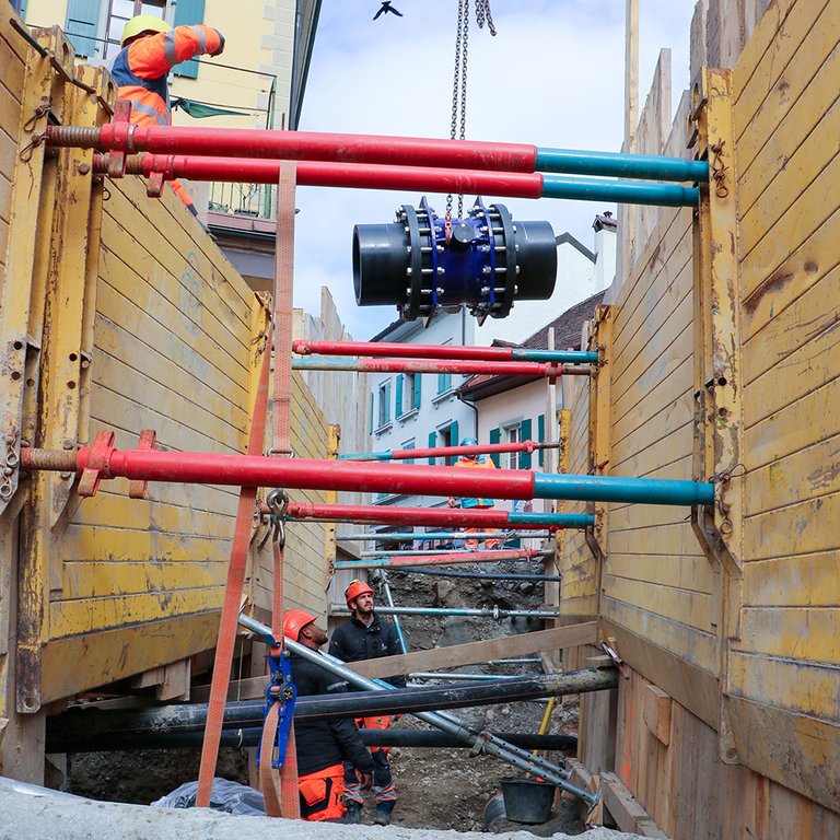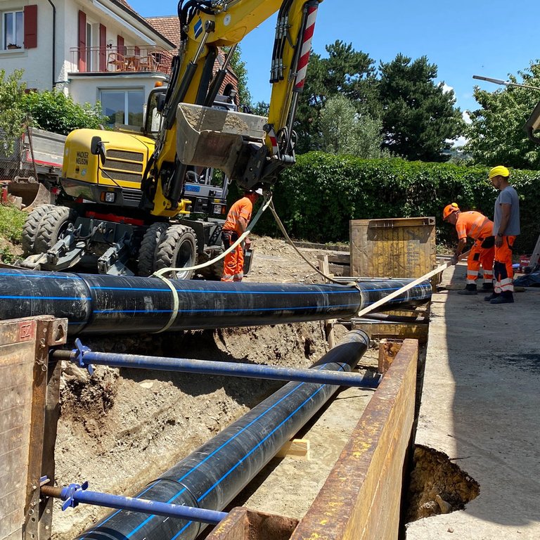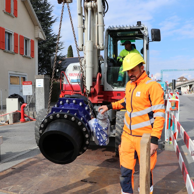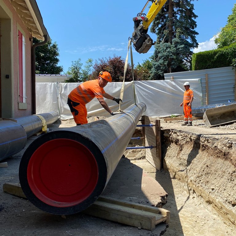 Les fouilles sous la Route de Lausanne sont bien entamées puisque 70 m de conduites ont été posés. Ces impressionnants tubes de 50 cm de diamètre permettront d'assurer un débit d'eau optimal dans le réseau de chauffage à distance. Chacun d'eux mesure 10 m de long et pèse 650 kg, raison pour laquelle il est nécessaire de les déplacer à l'aide d'une pelle mécanique. Des vannes de sécurité sont également posées tout au long du tronçon et pèsent chacune 400 kg.