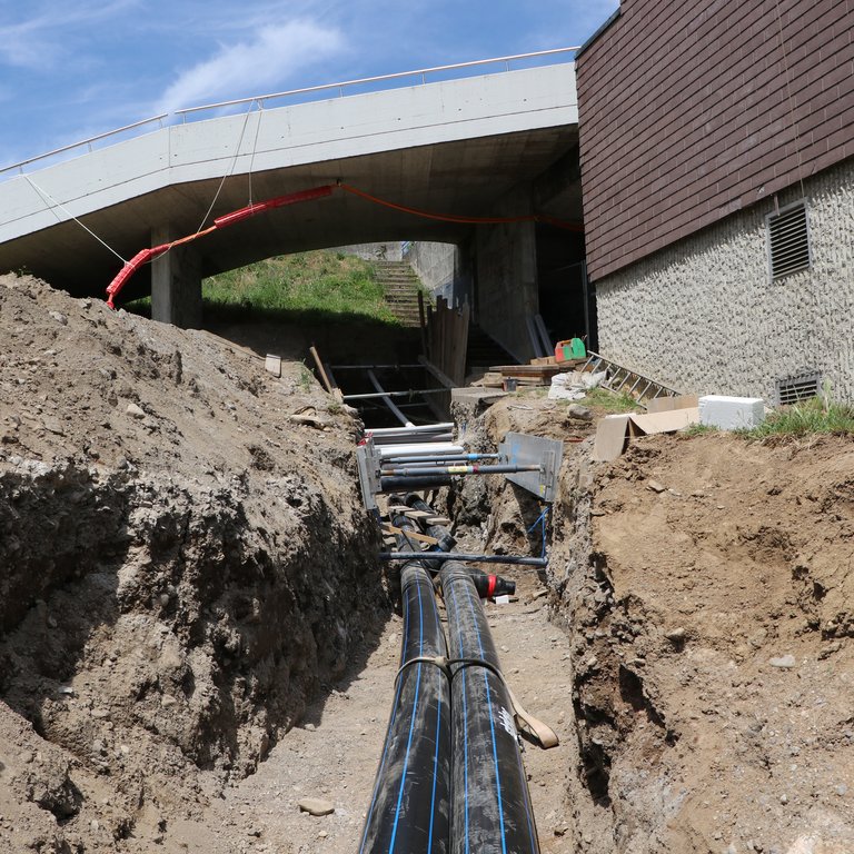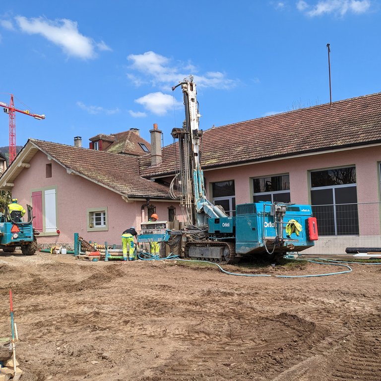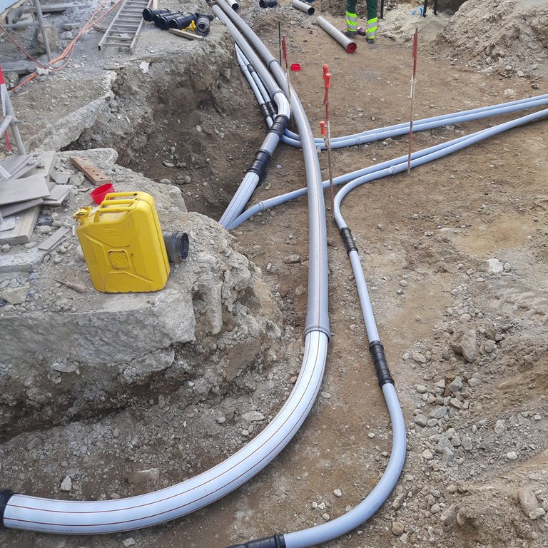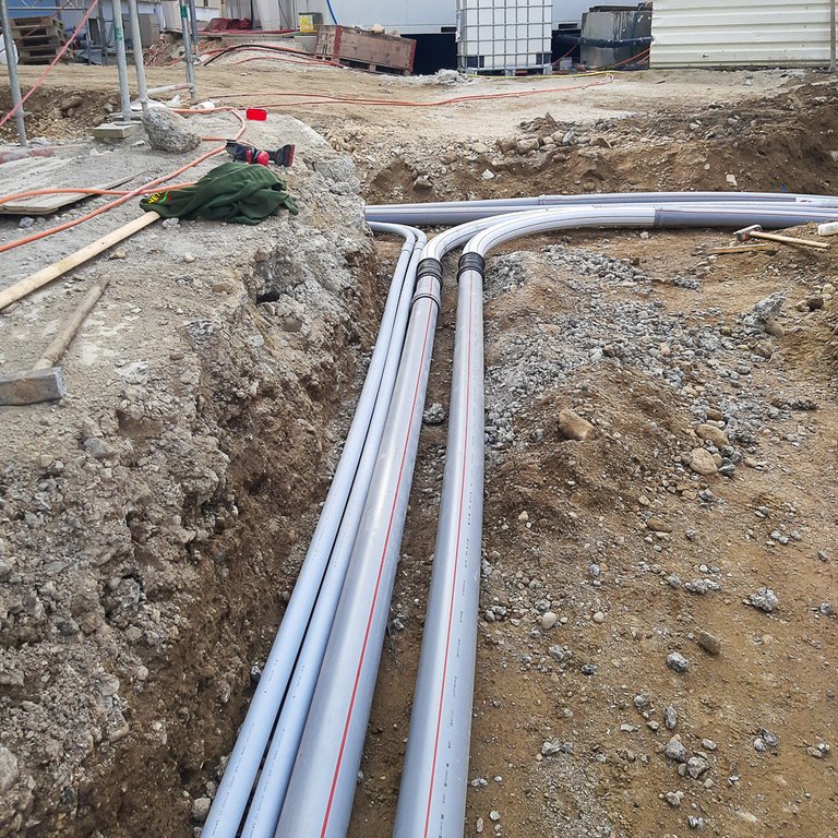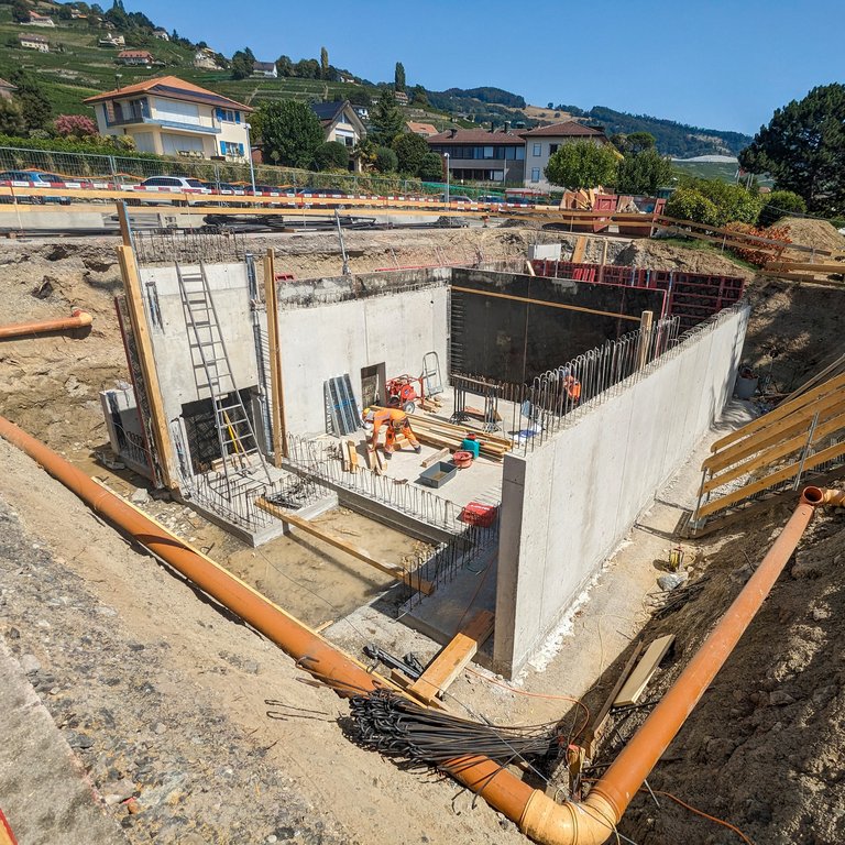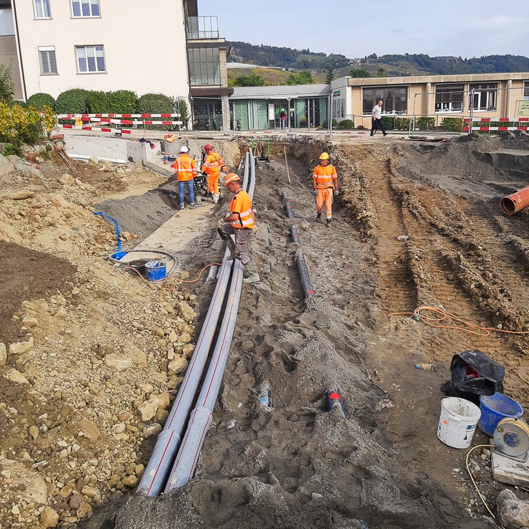 Du côté des Rives de Lavaux, les conduites pour le chauffage à distance et les câbles du microgrid ont été posés afin de raccorder les 4 bâtiments. Les pompes à chaleur ont été installées par Brauchli (n°5-10).