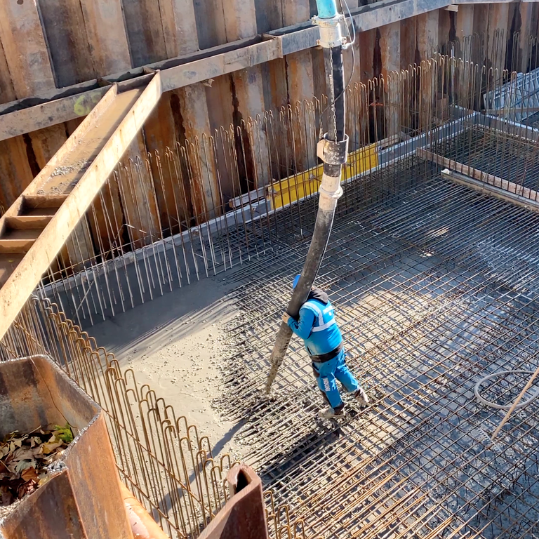 Les travaux se poursuivent au Bain des Hommes avec la construction de la STAPE, au fond de laquelle la dalle en béton a été coulée.
