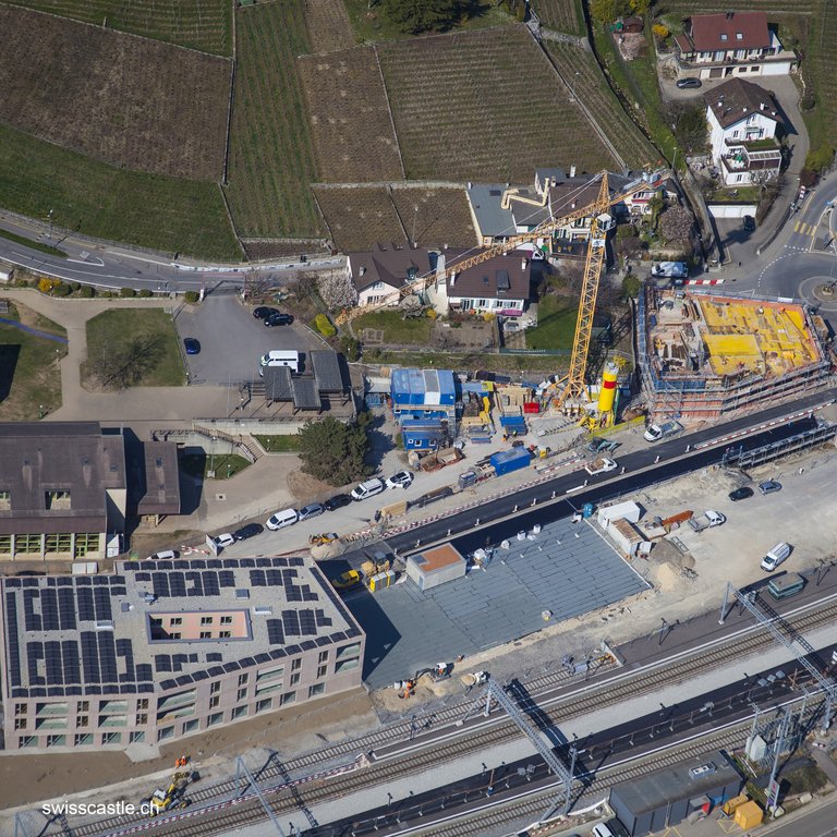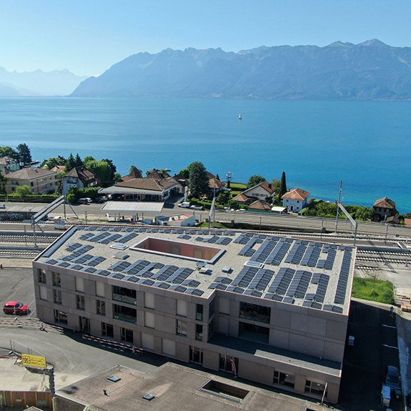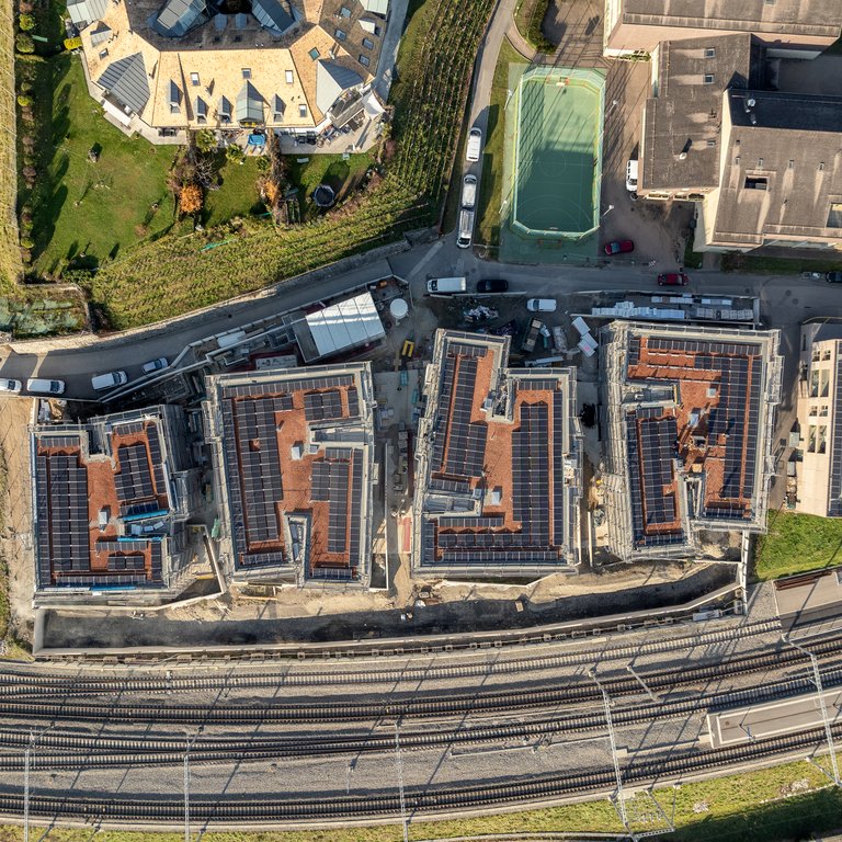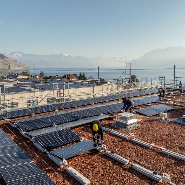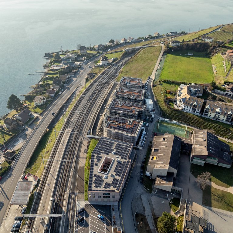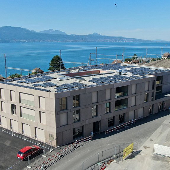 Du côté de la gare, les 4 bâtiments "Rives de Lavaux" sont bientôt terminés. Les équipes de notre société Agena ont posé les panneaux solaires en décembre (photos n°1 à 3), permettant aux installations d'être reliées au microgrid. Les équipes de Brauchli sont quant à elles en train de poser les pompes à chaleur.