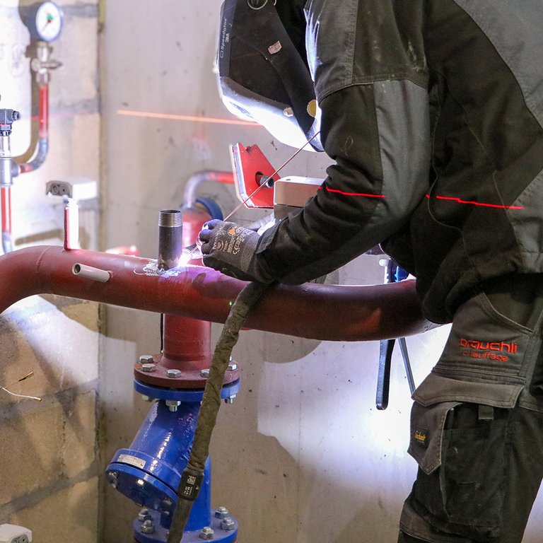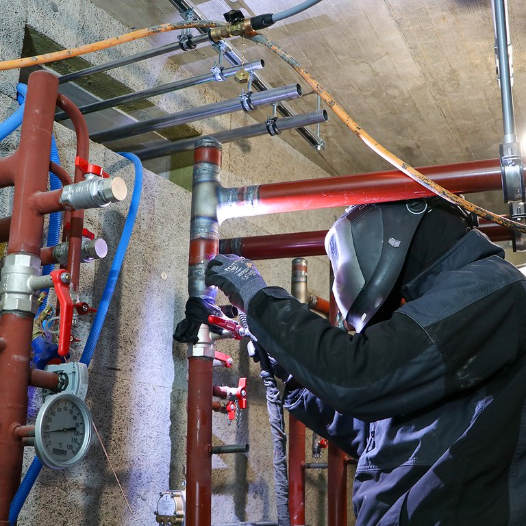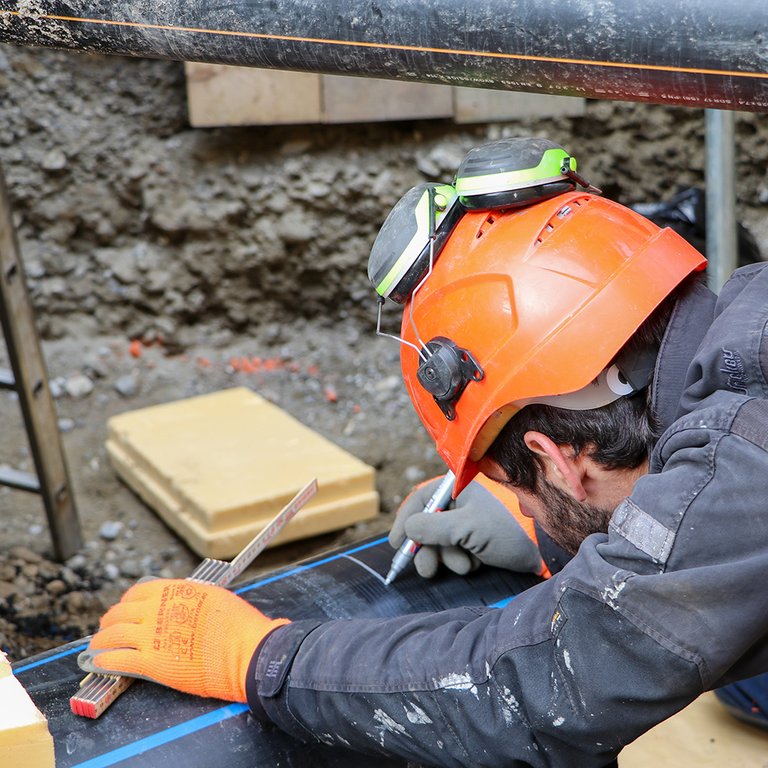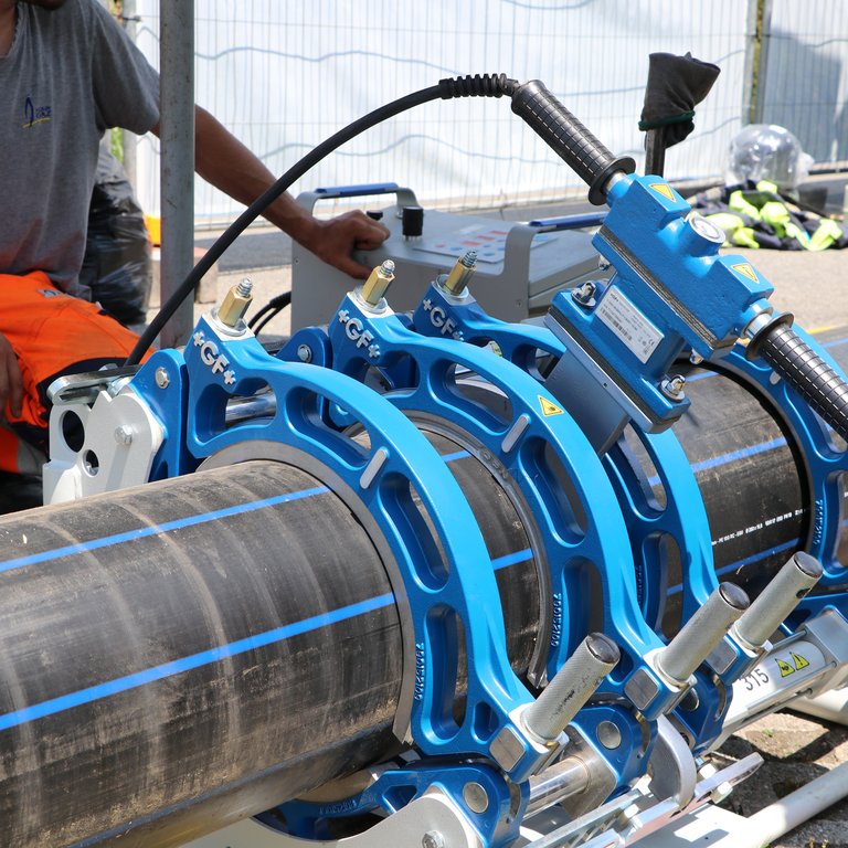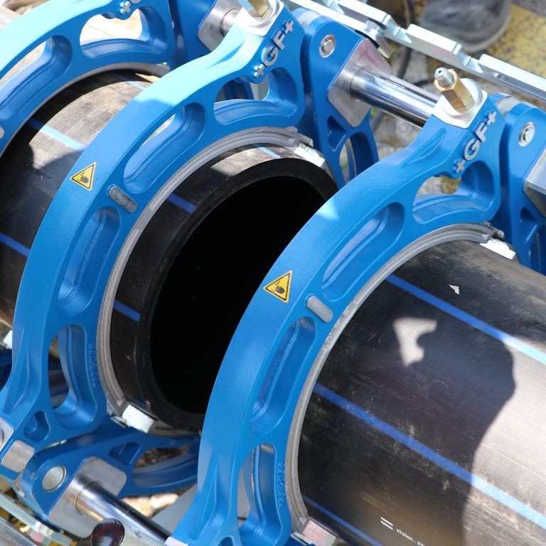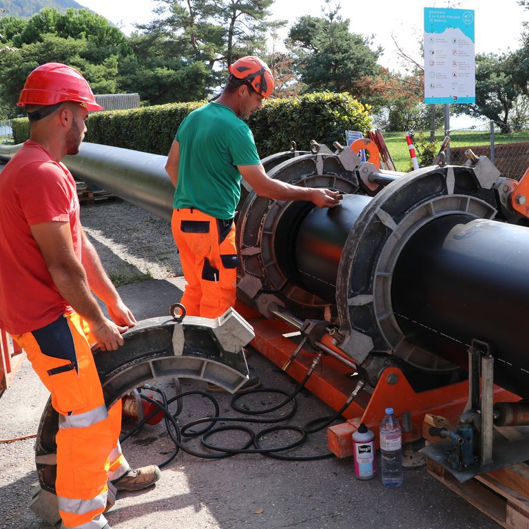 À l'aide d'un racleur mécanique, la première couche de matière est grattée sur chaque extrémité des conduites, permettant ensuite d'insérer ces dernières dans un manchon. Finalement, grâce à un processus d'électrosoudage, la matière fusionne et assure une parfaite étanchéité des conduites.