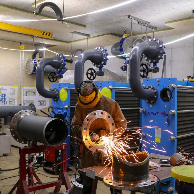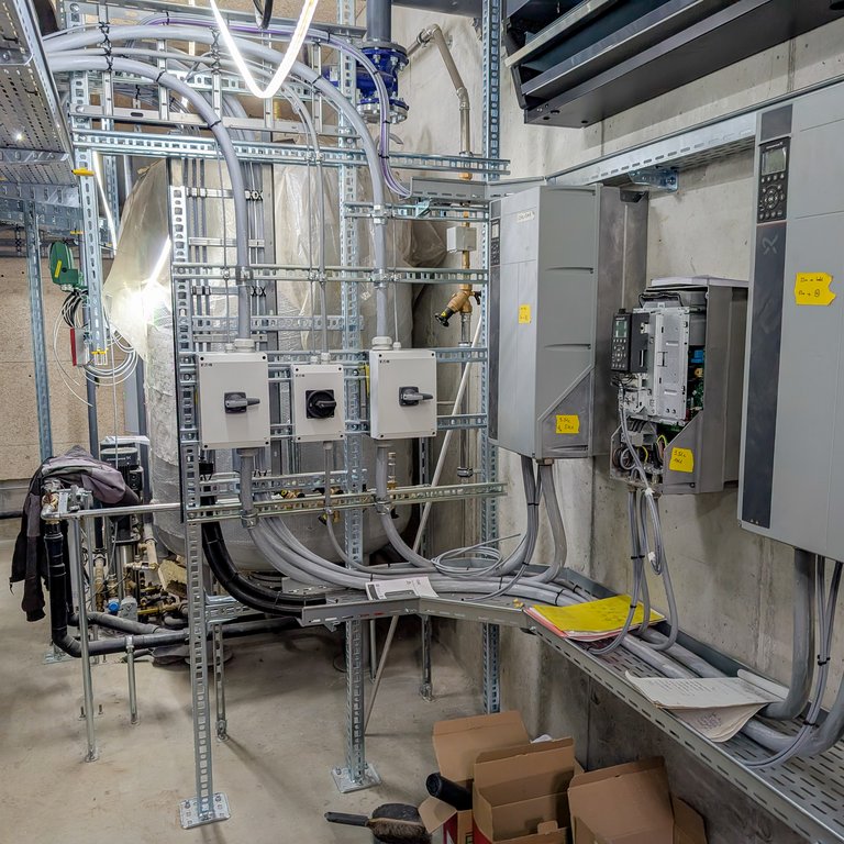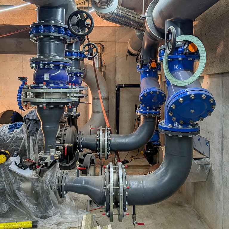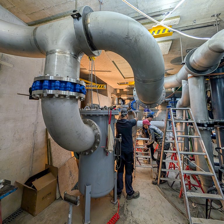 L'aménagement intérieur de la station de pompage et d'échange suit son cours. Les échangeurs de chaleur à plaques (première photo) ont récemment été installés, permettant l'échange de température entre l'eau du lac et l'eau du réseau de chauffage à distance. Ces installations sont réalisées par Brauchli, société du groupe Holdigaz.