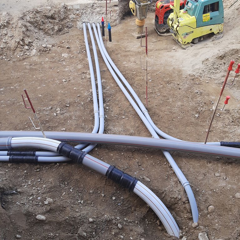 A l'Hôpital de Lavaux, nos équipes ont récemment posé les tuyaux servant à accueillir les câbles électriques pour le microgrid, permettant ensuite à notre partenaire Duvoisin-Groux de tirer les câbles au sein de ces derniers. Le raccordement de l'hôpital au réseau de microgrid est prévu le 11.12.