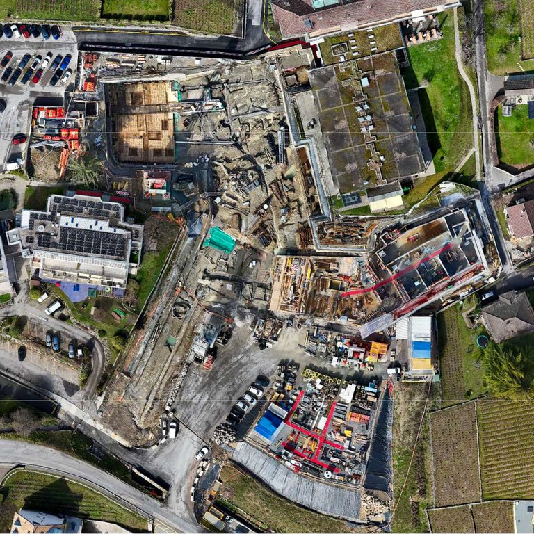 Le chantier de l'Hôpital de Lavaux est bien entamé, comme en témoigne la photo aérienne (n°4). Les tuyaux pour le CAD et le microgrid vont prochainement être posées jusqu'à l'entrée du nouveau bâtiment, en attendant leur raccordement l'année prochaine.