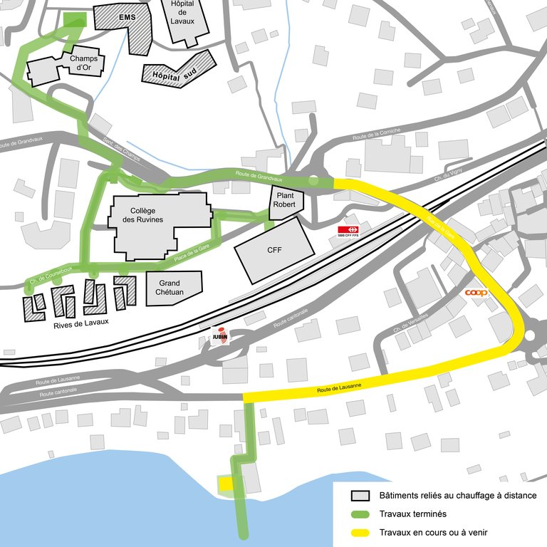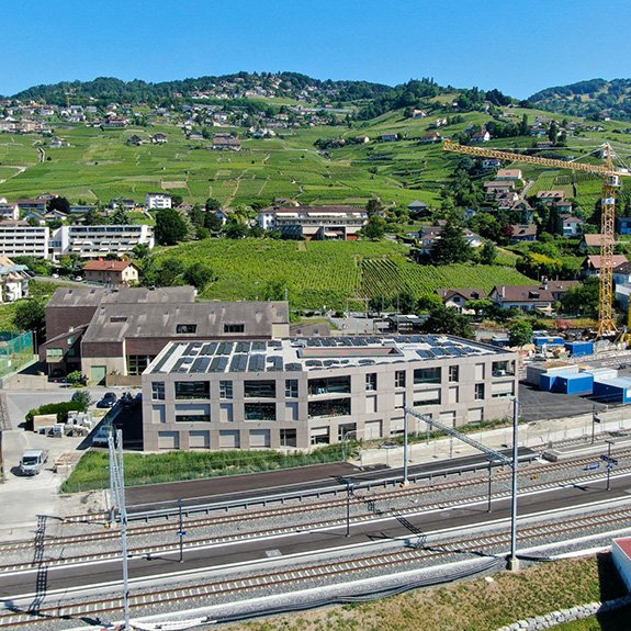 Du côté de l'Hôpital de Lavaux, le bâtiment principal est sur le point d'être raccordé au microgrid afin de bénéficier d'électricité renouvelable produite par les autres bâtiments reliés. Les conduites de chauffage à distance sont également en cours de pose afin de raccorder les nouveaux bâtiments en chantier. Ces travaux sont effectués en collaboration avec Marti Construction SA.