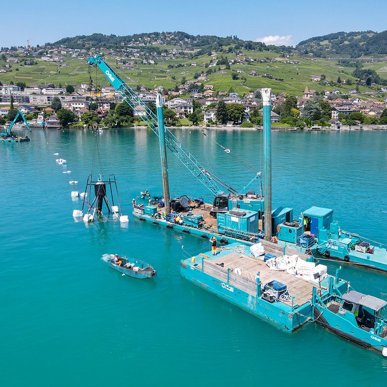 En parallèle, des forages ont été réalisés depuis le Bain des Hommes à env. 12 m de profondeur afin d'accueillir ces conduites. Acheminées par voie lacustre, ces dernières ont été coulées, avant d'être raccordées à la tête de forage puis tirées jusqu'à la station de pompage. Cette opération a nécessité l'intervention de plongeurs.