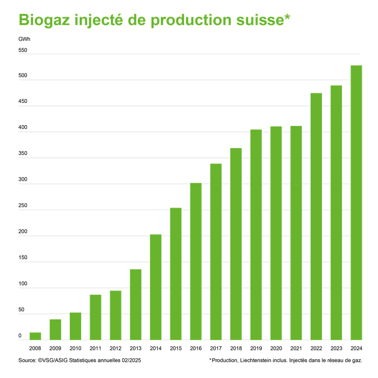 Suite à l’entrée en vigueur de la Stratégie énergétique et à la volonté de remplacer les énergies fossiles par des énergies renouvelables, l’industrie gazière suisse a pris l’engagement d’investir dans le développement du biogaz, avec l’objectif de produire 15% de gaz renouvelables d’ici à 2030, 50% d’ici à 2040 et d'atteindre la neutralité carbone à l'horizon 2050.